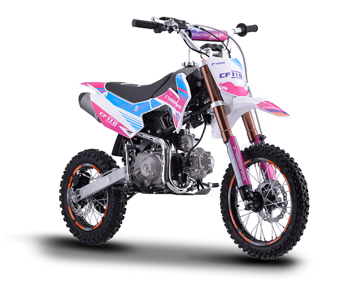 Crossfire CF110 – 110cc Semi-Automatic Kids Dirt Bike electric and kick start The latest CF110 combines an updated lighter frame design and better suspension to deliver agile and fun performance for all ages. The bike retains the kick starter but also features electric push button start.The latest CF110 combines an updated lighter frame design and better suspension to deliver agile and fun performance for all ages. The bike retains the kick starter but also features electric push button start. The CF110 is an entry level bike designed for trail riding and getting your youngster into the sport. The auto clutch is a great way to learn the gears while not worrying about having to deal with the clutch. The CF110 E start engine size makes it easy for our dealers to tune in a super-wide torque spread and easy-to-access low-rpm power. The right size and the right power delivery Crossfire CF110 gives riders the best of both worlds. In terms of seat height and weight, the CF110 is between our CF70 and CF125. The 4 stroke engine is refined and smooth teamed up with our four-speed transmission with automatic clutch that’s been proven in ten years of bikes. WARRANTY 6 months up to 12 months* *If 1 month and 6 months services have been done by a Crossfire Dealer – warranty is extended to 12 months for vehicles up to 250cc. Please make sure you have proof of services.