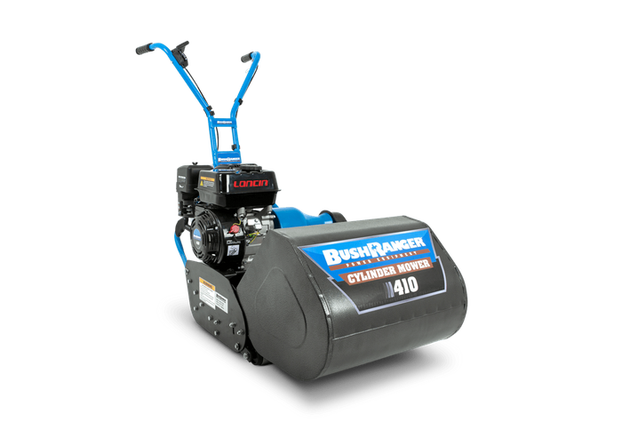 Bushranger 410CM Cylinder Mower Packed with power and great features the 410CM will turn your lawn into the talk of the town. Turn your lawn into the talk of the town with Bushrangers 410CM cylinder reel model. This unit is equipped with a powerful Loncin G200F, OHV 196 cc engine which features low oil cut out. Other great features include a large 3.6 litre fuel tank, chain drive, an adjustable cutting height of 7 - 20 mm and a metal grass catcher. Loncin G200F, 196 cc OHV engine. Electronic ignition. Low oil cut out. 600 ml oil capacity. 3.6 Litre fuel tank. 17" (430 mm) cut. Adjustable 7 mm - 20 mm cutting height. Hardened bed knife for long lasting quality of cut. 6 blade cutting reel. Metal grass catcher. Metal front roller. Split, cast rib rear roller. Chain drive.